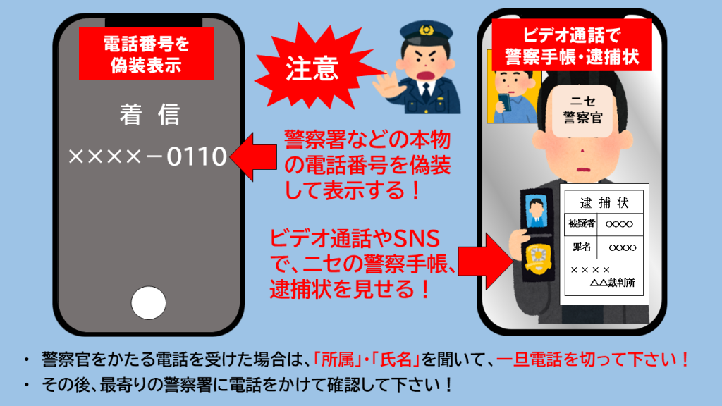 - 警察官になりすまし、ターゲット(あなた)を容疑者とみなし、捜査協力を求めてくる。